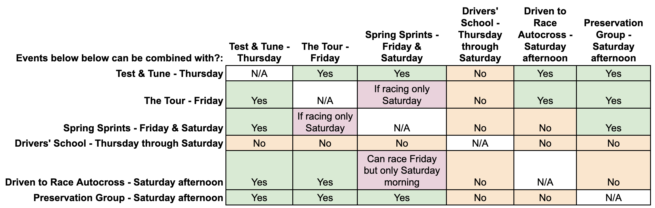 You’ll get about 2 hours of track time with professional instruction on the half-mile Proving Grounds autocross course and lap the iconic Lime Rock road course. Two groups of 12 cars each and you can enter with just about any car.